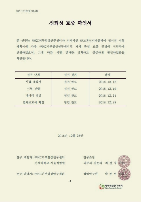 기능성 화장품이라고 말해도 직접 눈으로 볼 수 있는 객관적 증거가 있어야 믿을 수 있죠. 그래서 인체적용 결과보고서를 가져왔습니다. 또한, 2020 대한민국 품질 혁신대상을 수상했습니다.