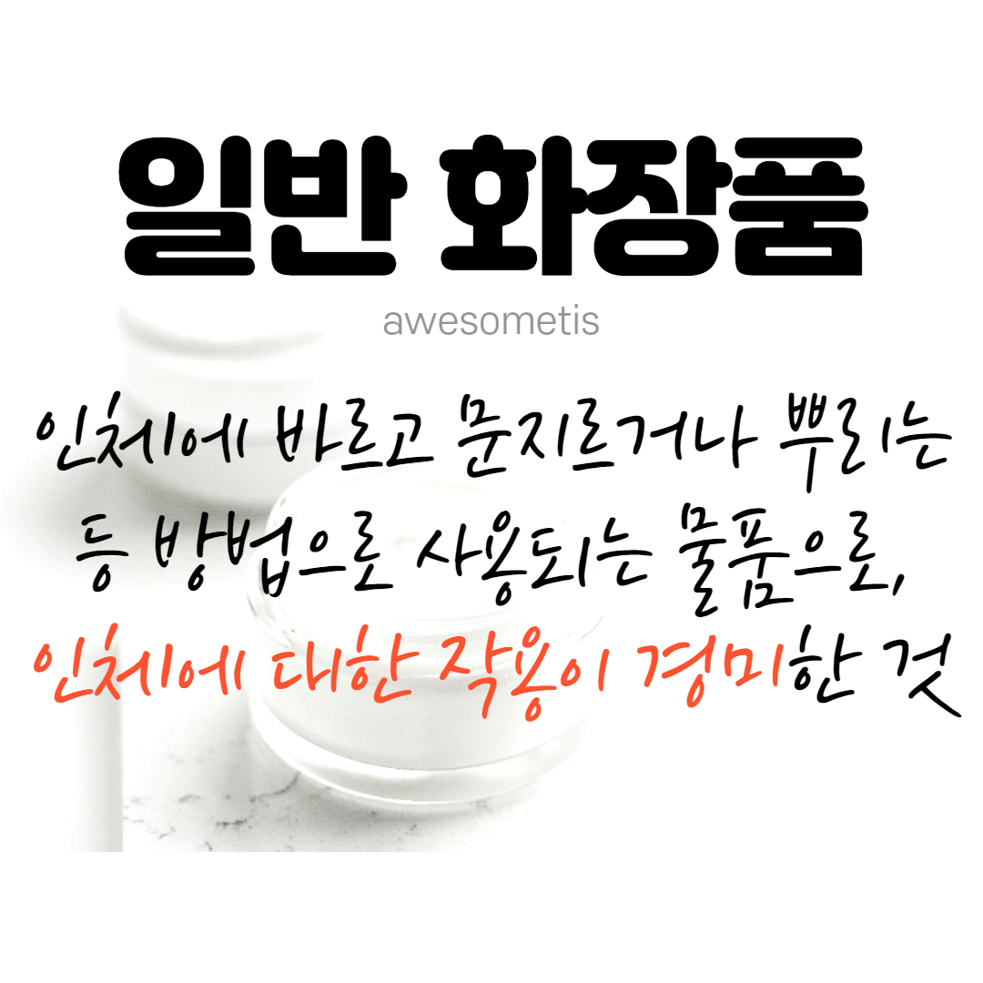 위의 사진에서 나온것처럼 일반 화장품은 작용이 경미한 화장품을 말합니다. 기능성 화장품은 미백, 주름개선, 피부 보호, 영양 공급 등 피부에 효과가 있는 화장품을 뜻합니다. 우리 매일 바르는 화장품, 작용이 경미한 액체 말고 피부에 효과가 있는 '기능성 화장품'을 발라요!